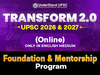TRANSFORM 2026 - Year Long Foundation & Mentorship Program by "US" - Targeted Lectures by Expert Faculties on all subjects. - Entire Syllabus Coverage in a very targeted way by End of Jan - Mentorship & Peer Group under an Expert Mentor. - Mains Answer Writing Lectures through PYQs - Entire Prelims Module included - Prelims Test Series Included - Mindset Building Sessions by Psychologist - CSAT Lectures included - Current Affairs Module Included